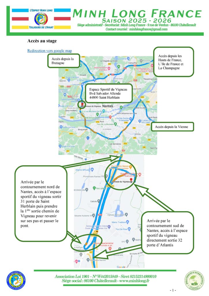 La saison avance. Après les magnifiques Coupe du Nord et Coupe de France, retour aux stages. Après Châtellerault pour un stage tous niveaux en Nouvelle Aquitaine et Marolles en Ile de France pour le traditionnel stage « Enseignants et Assistants » c’est au tour de la Loire atlantique d’accueillir les pratiquants de l’école Minh Long pour un stage tous niveaux.