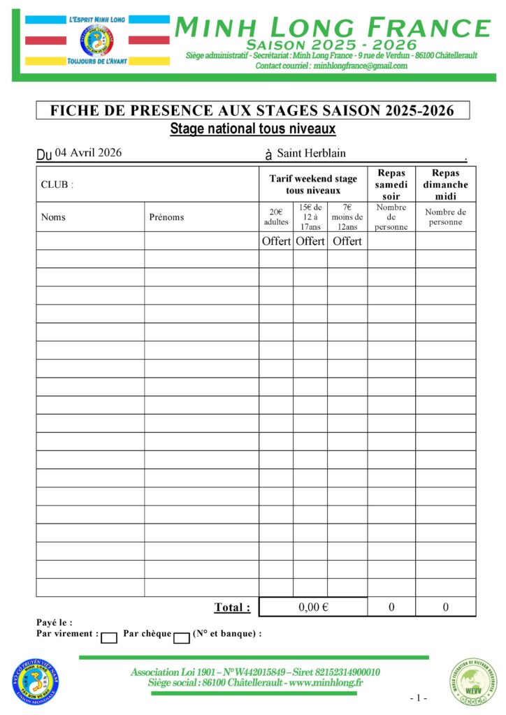 Vous pouvez remplir la fiche de présence directement en ligne puis l’imprimer ou l’enregistrer pour l’imprimer ultérieurement ou l’envoyer par mail à minhlongfrance@gmail.com.
